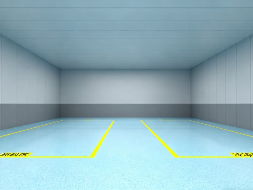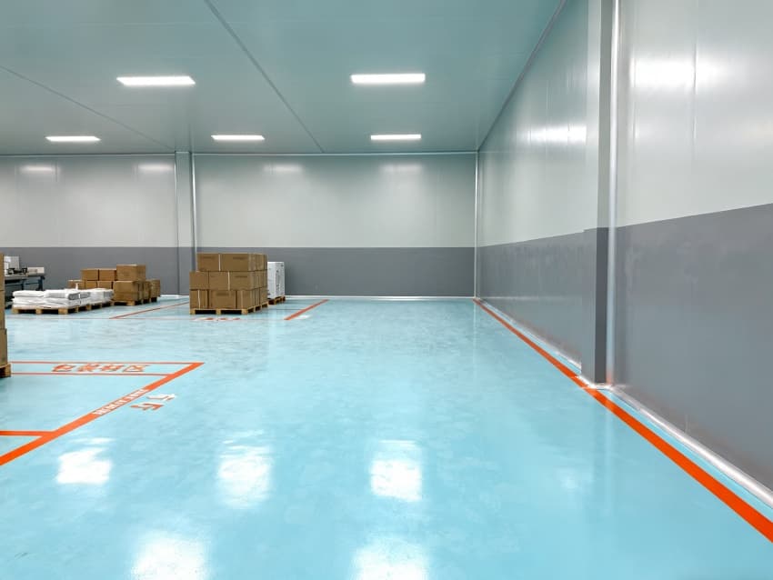 車間統(tǒng)一采用淺藍(lán)色耐磨環(huán)氧地面,兼具抗沖擊、易清潔特性,適配鈑金加工、總裝等多環(huán)節(jié)的設(shè)備安裝與物料轉(zhuǎn)運(yùn)需求;四周灰色防霉墻壁經(jīng)耐污處理,耐磨損且不易顯臟,配合頂部均勻布光系統(tǒng),營(yíng)造明亮舒適的生產(chǎn)環(huán)境。?