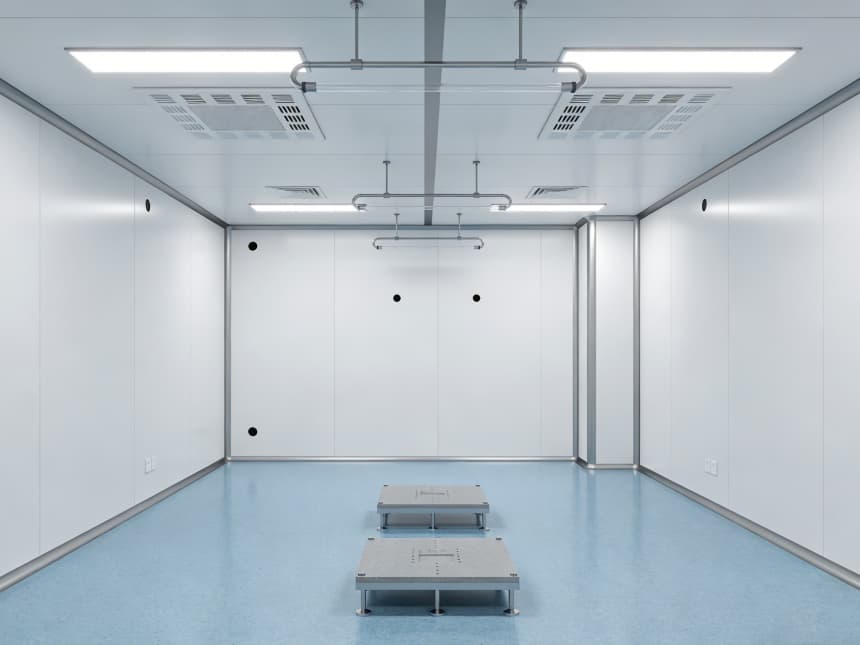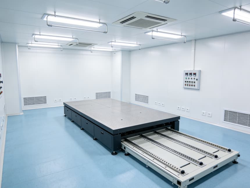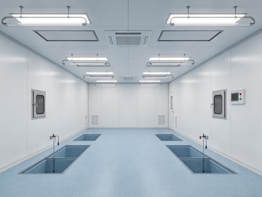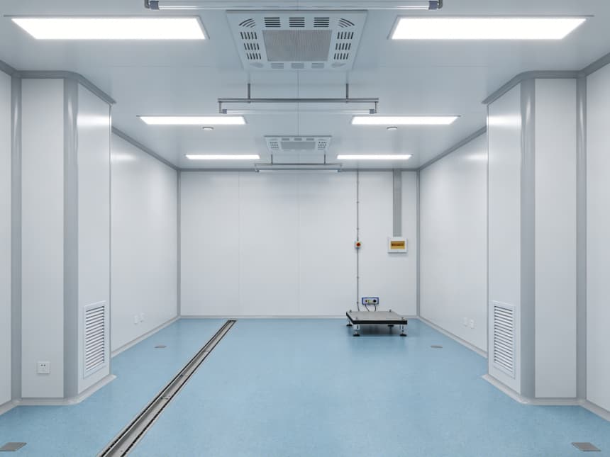 電子光學車間內部細節設計精準匹配行業核心需求,整體采用淺藍色防靜電潔凈地坪與白色無縫潔凈墻面的組合,風格簡約統一。地面選用3mm厚環氧防靜電材質,表面經啞光工藝處理,既能有效規避強光反射對光學檢測造成的干擾,又具備10?-10?Ω的穩定防靜電性能;同時兼具優異的耐磨特性,可耐受酒精等常用清潔劑擦拭,墻角均采用50mm圓弧設計,從根源上消除積塵死角,筑牢潔凈基礎。