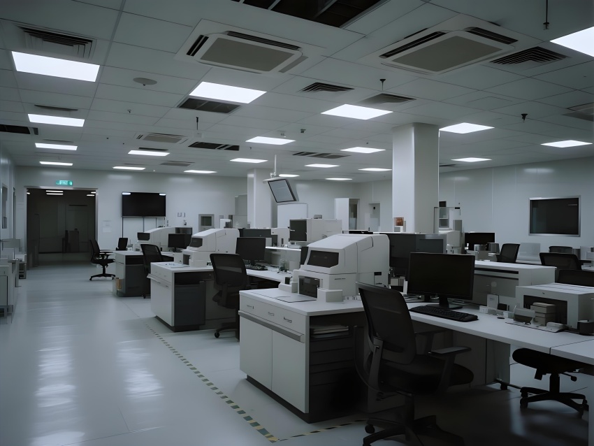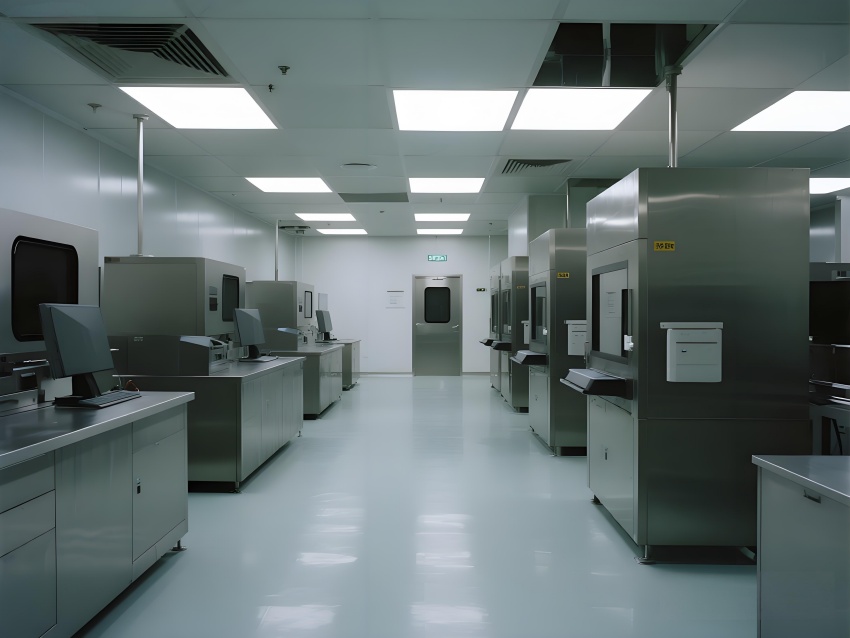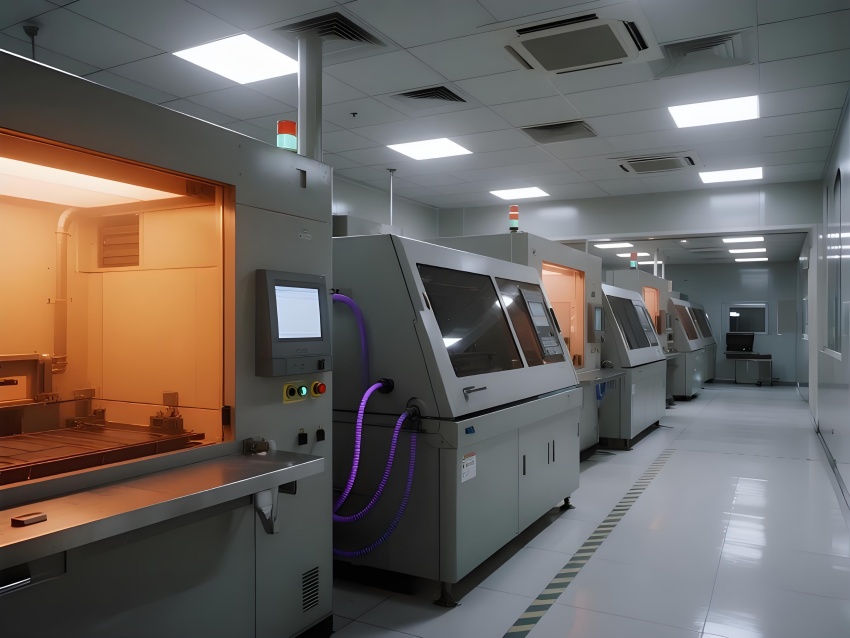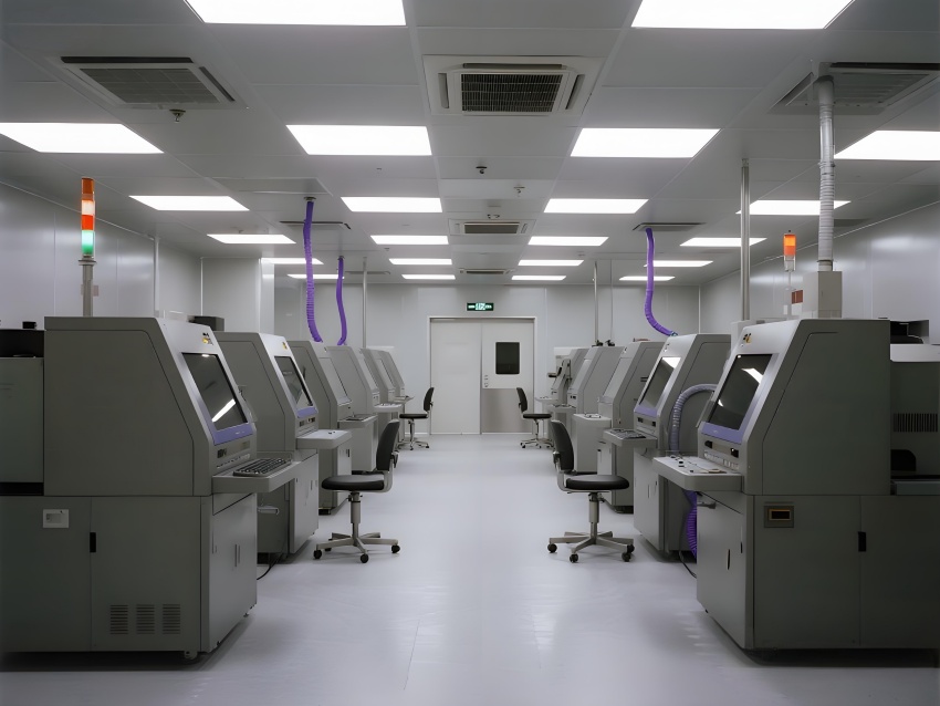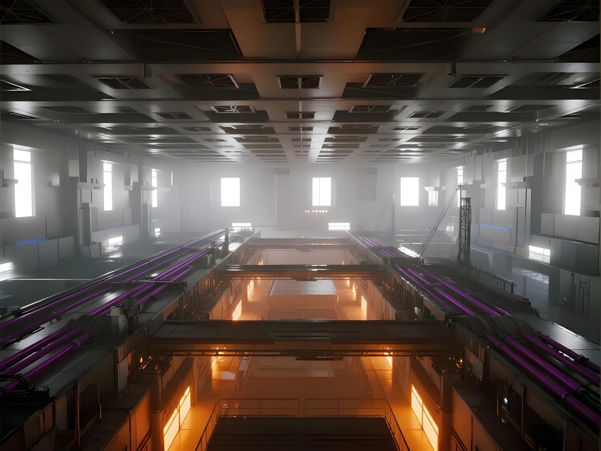 本芯片廠采用"硅基未來主義"設計風格,將納米級制造的精密感轉化為宏大的工業美學。空間以鈦銀與深空灰為主色調,光刻區的琥珀色防霧照明與蝕刻區的冷紫工藝氣體管道形成科技光譜。高架地板下的藍色氣流指示燈模擬集成電路紋路,天花板的矩陣式FFU單元如晶圓陣列般規整。透明設備艙內機械臂的精準運動軌跡,與墻面懸浮的晶圓生產數據流構成動態敘事。防靜電涂層的金屬質感表面反射出潔凈室的無限縱深感,關鍵區的紅色激光定位光幕則強化半導體制造的危險與精確。通過嚴格的功能色彩編碼(黃-光刻/紫-蝕刻/藍-檢測)和極簡的無縫設計,在滿足ISO14644Class1標準的同時,塑造出如同微觀芯片放大至建筑尺度的震撼視覺隱喻。