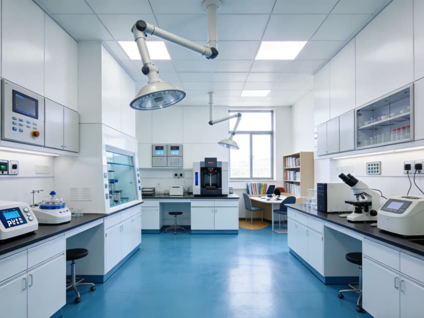 精密檢測實驗室:劃分物理檢測區與化學分析區,采用防震地面與生物安全柜,為力學性能測試、微生物限度檢測等提供穩定環境;墻面嵌入緊急洗眼器與安全噴淋裝置,強化實驗安全防護。