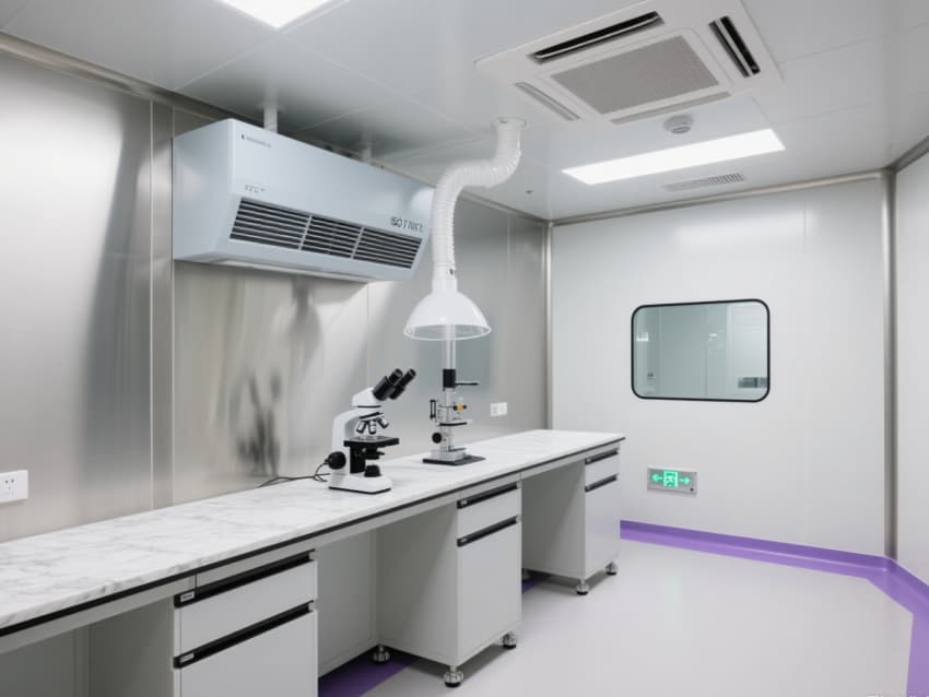 實驗室以銀白色抗菌金屬彩鋼板構建墻體與吊頂,搭配淺灰色防靜電環(huán)氧地坪,金屬質感與冷色調結合,既強化潔凈氛圍,又具備抗腐蝕、易消毒特性。墻面與地面的圓弧過渡設計消除積塵死角,頂部密布的FFU風機過濾單元形成垂直層流,配合側下回風系統(tǒng),實現(xiàn)每小時25-30次空氣置換,持續(xù)維持室內正壓。?