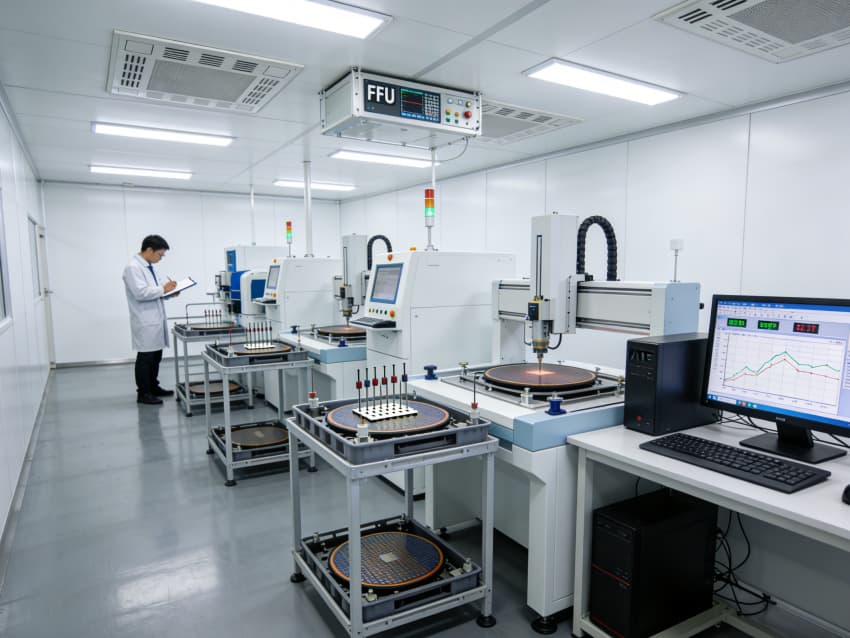 白色墻面采用工業級高潔凈抗菌涂層,推行無縫拼接與高精度找直工藝,陰陽角采用R60圓弧倒角設計,徹底消除積塵死角。廠房科學劃分光刻區、蝕刻區、沉積區、封裝測試區等核心區域,光刻區配備百級層流凈化與恒溫恒濕系統,溫濕度誤差控制在±0.2℃、±2%RH內;蝕刻區增設防微振阻尼墊層與專用廢液收集管線;各區域均預留智能化設備接口與屏蔽防護裝置,全方位保障芯片制造的精準性與穩定性。