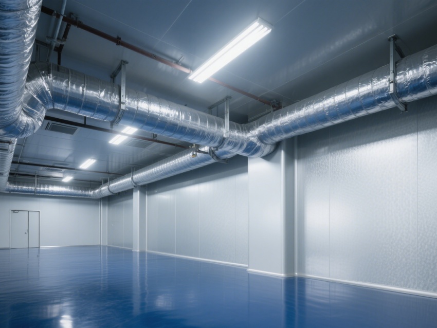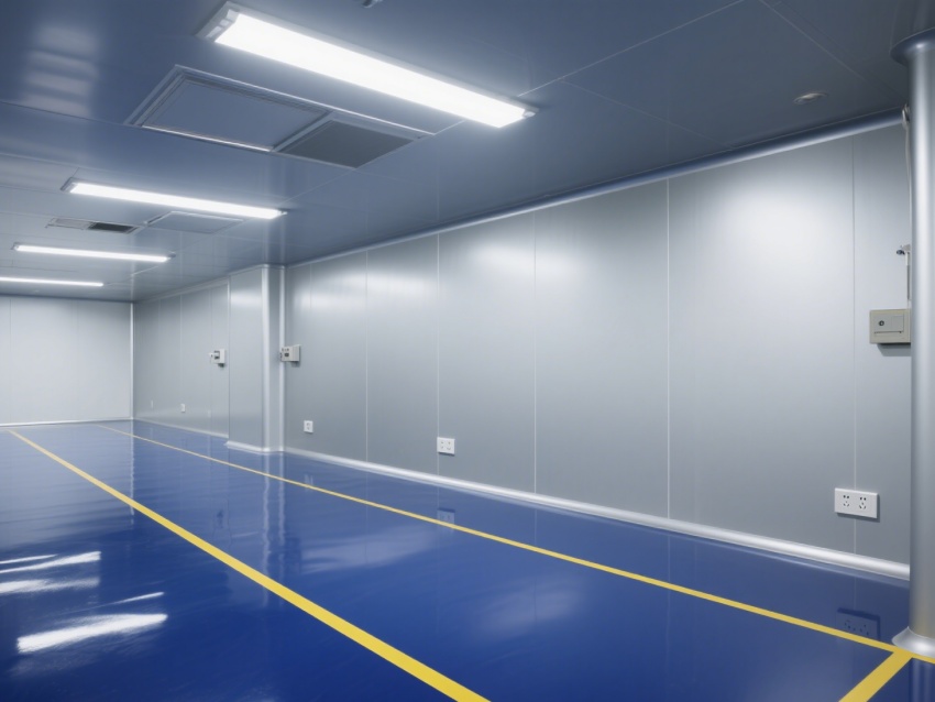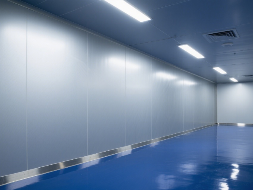 車間內部整體呈銀灰色和藍色,給人一種現代感和科技感。墻面、地面和天花板均采用無縫設計,便于清潔和消毒,防止灰塵和微粒的積聚。照明系統明亮且均勻,提供了良好的工作環境。