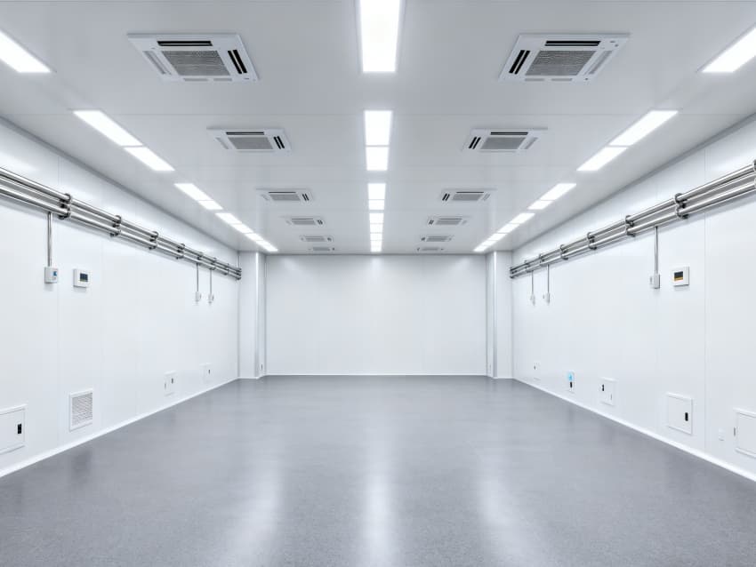 內部6個生產車間均為無設備空曠布局,按百級潔凈標準建設:地面鋪設防靜電環氧自流平,墻面采用無顆粒潔凈彩鋼板,陰陽角做R30圓弧處理杜絕積塵;柱網間距設為9米,預留光刻機、晶圓檢測設備等重型設備安裝點位;頂部整合恒溫恒濕系統、高效空氣過濾器及防頻閃LED照明,所有管線暗藏于吊頂內,最大化釋放空間高度,為芯片晶圓制造、封裝測試等核心環節提供超潔凈、高穩定的專屬生產環境。