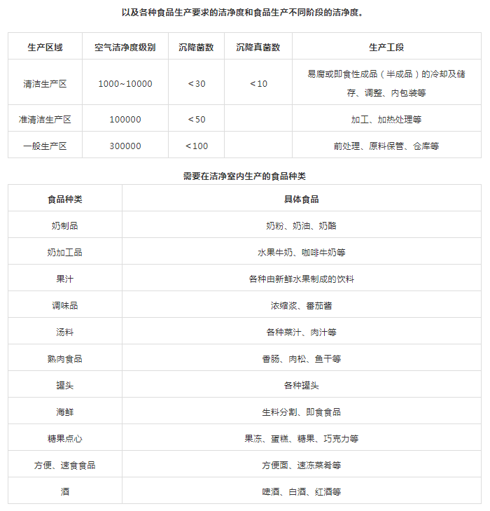 3、清潔作業區(潔凈室):指衛生環境要求最高,人員、環境要求較高,必須經過消毒和更衣才可以進入,如:原料、成品裸露的處理區域,食食品的冷加工間、即食食品的冷卻間、待包裝即食食品的儲存間、即食食品的內包裝間等。食品廠不同生產區域和空氣潔凈度等級