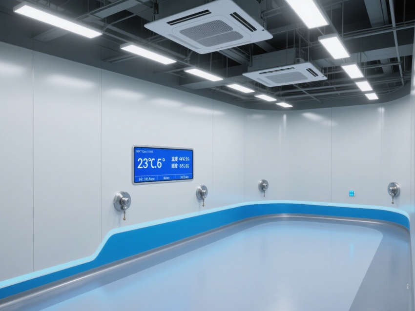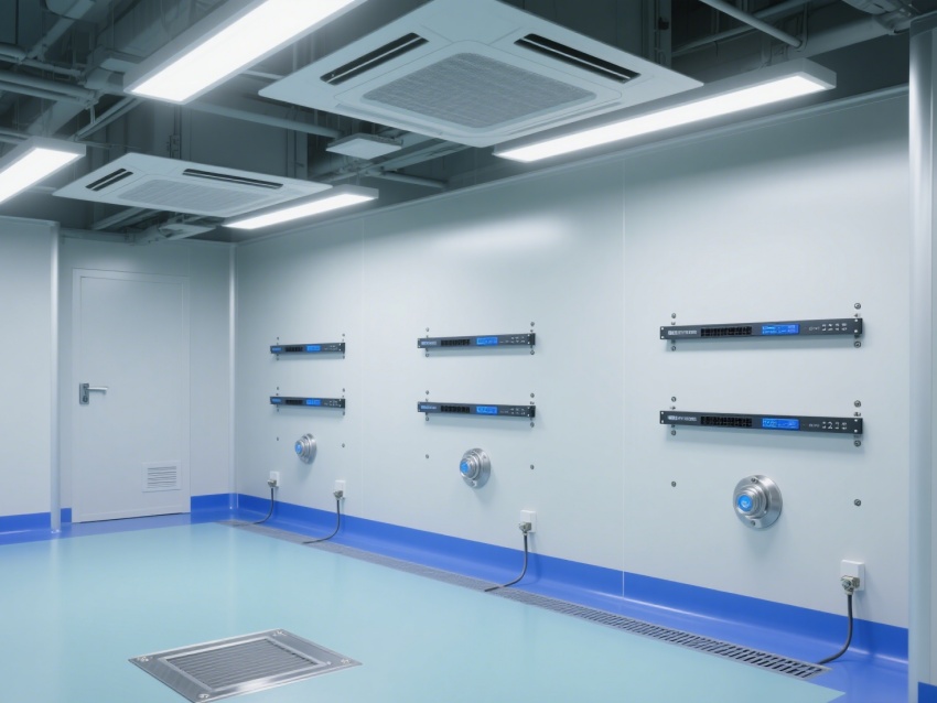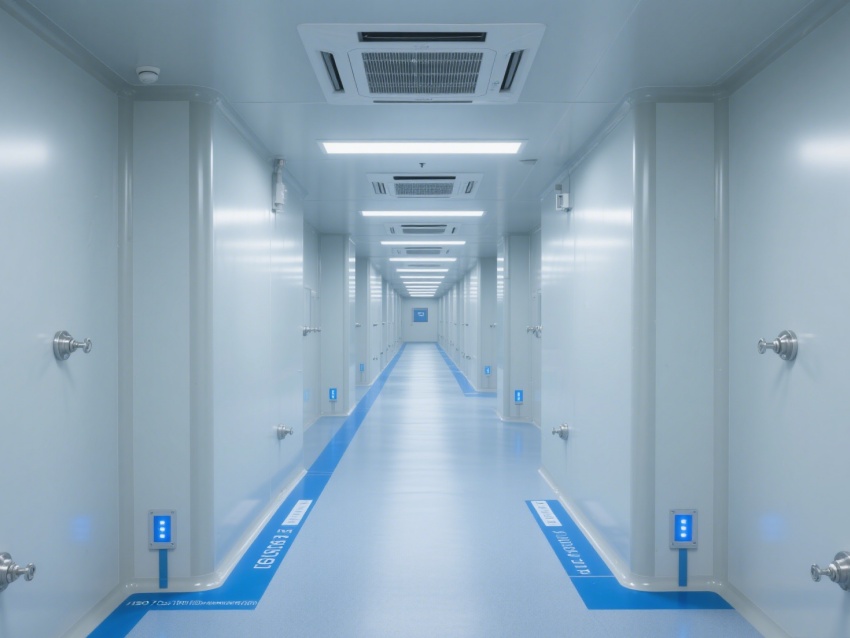 走廊采用一體化潔凈設計,地面藍色標識線清晰規劃動線,各類管線與設備布局兼顧功能性與美觀性。整體工程通過材質選用、空氣凈化、智能監控的協同,為芯片檢測提供了超潔凈、高穩定的專業環境,有力保障芯片檢測的精度與可靠性,是芯片研發與質量把控的核心技術支撐單元。