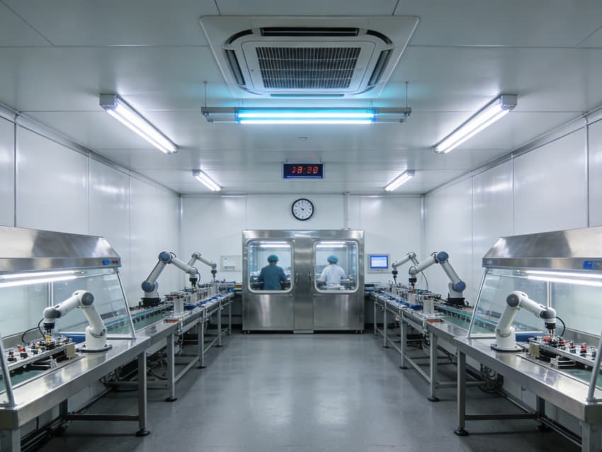 白色墻面采用食品級潔凈抗菌涂層,推行無縫拼接工藝,陰陽角采用R50圓弧倒角設計,徹底消除清潔死角,潔凈度可達Class 8級標準。車間科學劃分無菌裝配區(qū)、檢測區(qū)、物料倉儲區(qū)等功能區(qū)域,無菌區(qū)配備層流凈化預留系統,檢測區(qū)預留精密檢測儀器安裝位與恒溫調控接口,各區(qū)域均設置獨立消殺通道與物料傳遞窗口,全方位護航醫(yī)療器械生產品質。